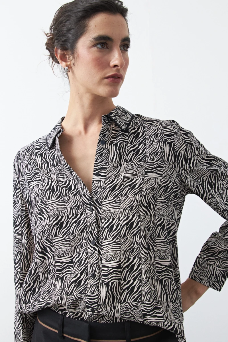 Camisa estampada de manga larga confeccionada en tejido liviano que acompaña el movimiento y aporta una caída fluida. El diseño se destaca por el detalle del cuello, con terminación sutil que suma carácter y eleva la prenda, logrando un equilibrio justo entre lo clásico y lo actual.
