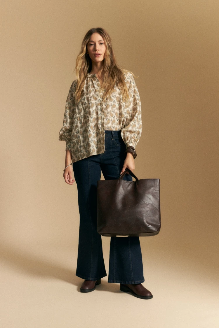 Camisa estampada de manga larga que aporta movimiento y carácter a la silueta. De calce relajado y escote con leve abertura, presenta frunces en el delantero que suman volumen suave y un acabado delicado. Las mangas largas con puño elastizado acompañan la caída fluida del tejido, logrando una prenda cómoda y versátil.