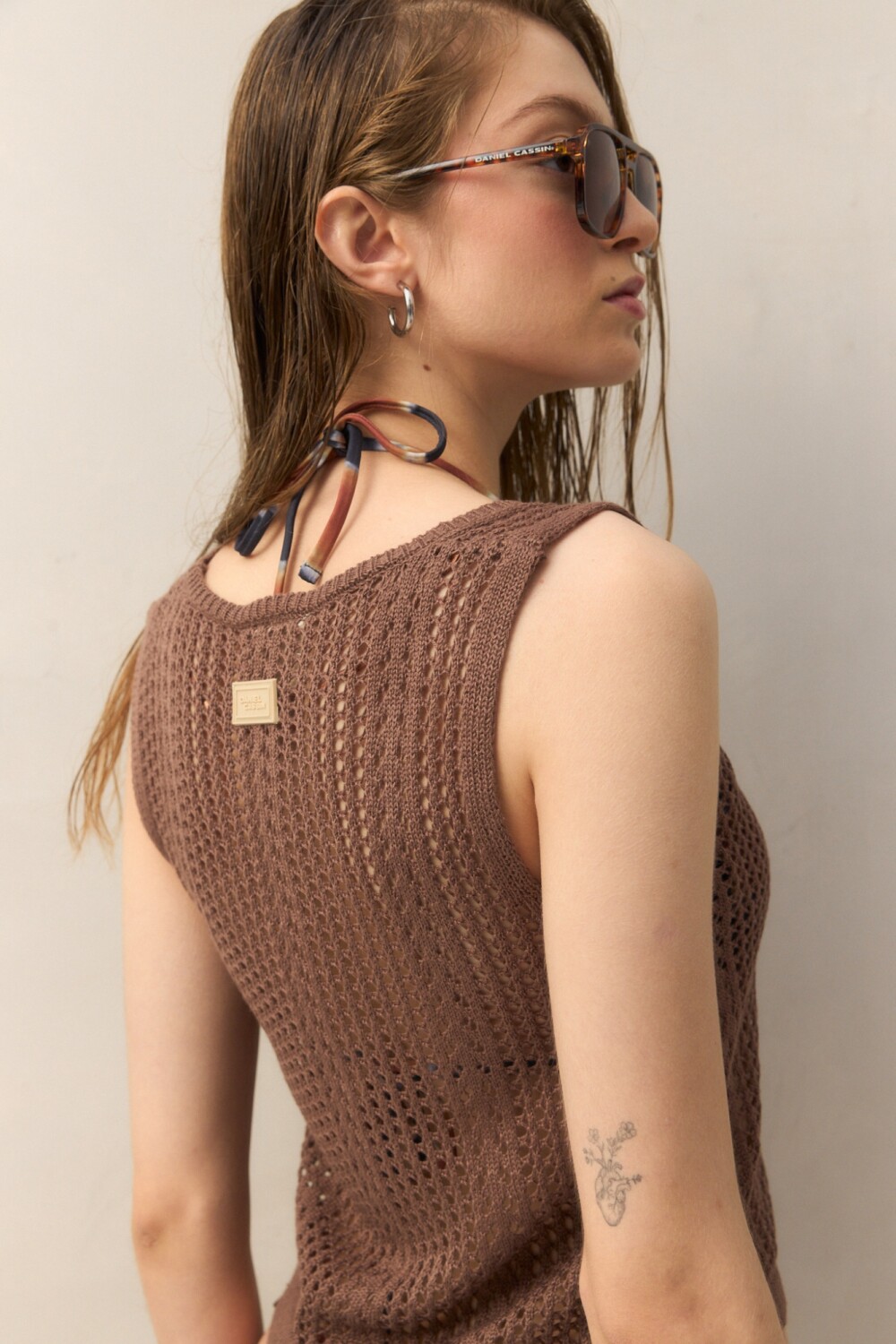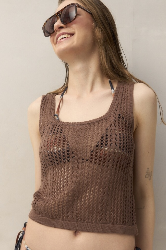 Top de tejido abierto, un infaltable para potenciar looks de playa y días cálidos. Su trama calada aporta textura y un aire relajado. El acabado recto en el ruedo mantiene una silueta simple y trendy, perfecta para sumar a un total look de verano.